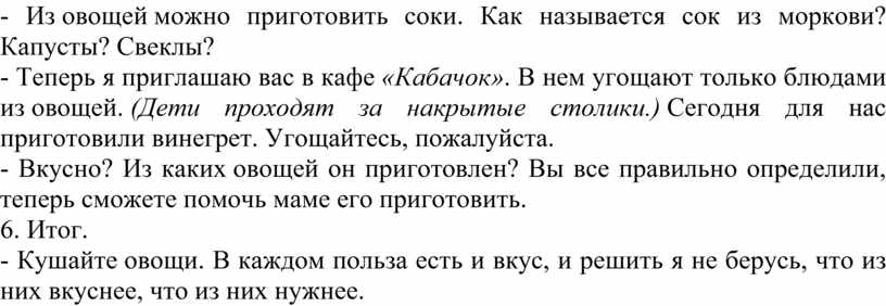 - Теперь я приглашаю вас в кафе «Кабачок». В нем угощают только блюдами из овощей. (Дети проходят за накрытые столики.) Сегодня для нас приготовили винегрет. Угощайтесь, пожалуйста.