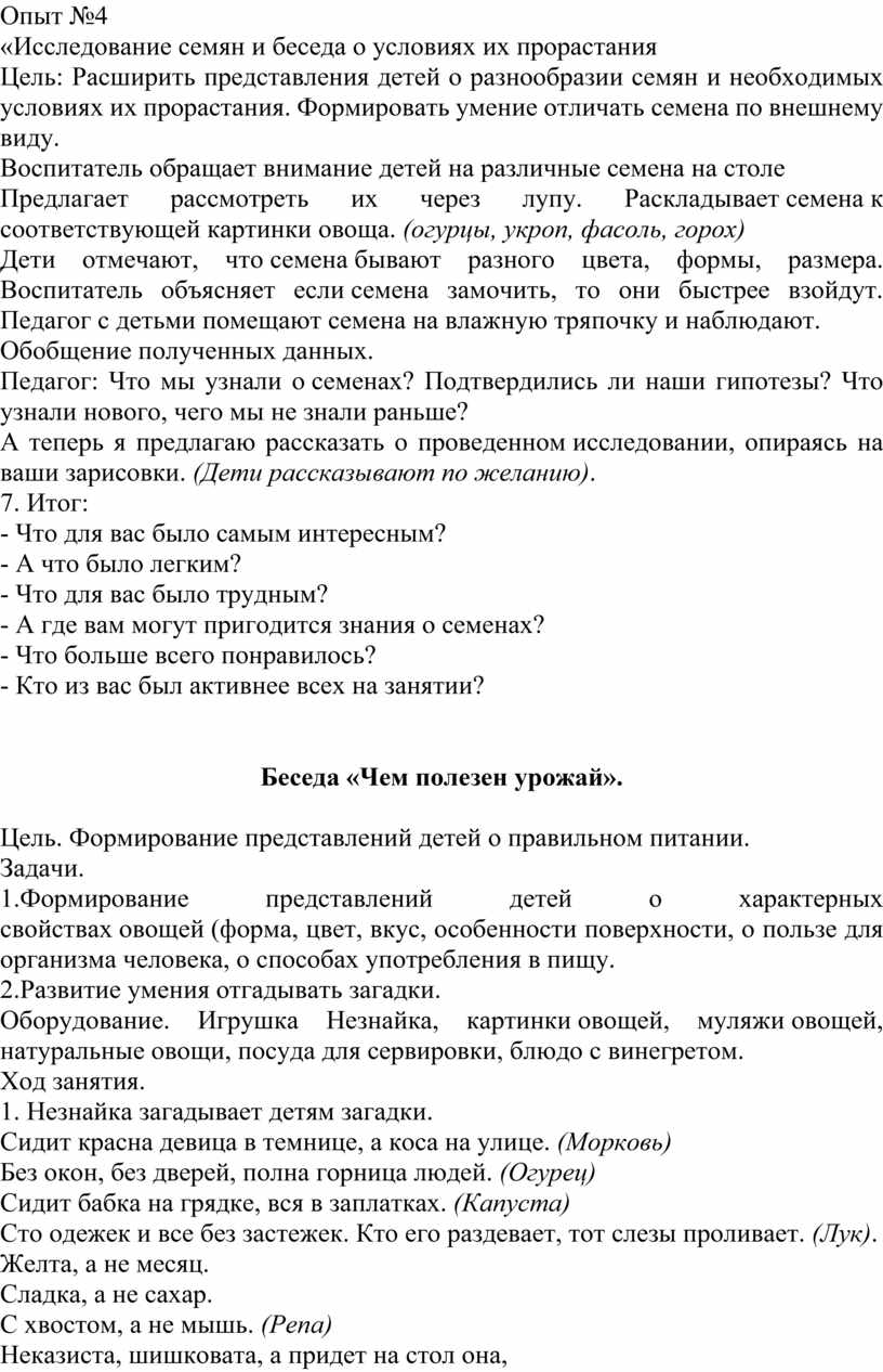 1. Беседы: «Для чего нам нужны растения?», «Что такое лаборатория», «Как размножаются растения», «Как прорастает семечко», «Что мы можем вырастить на подоконнике?», «Как влияют разные условия на рост растений», «Природа – наше богатство», «Человек и огород», «Свойства воды. Кому нужна вода?», «Правила работы в экспериментальном уголке».