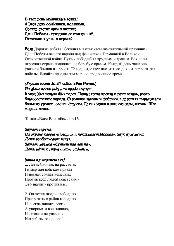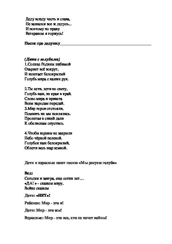 Сценарий праздника Победы (старший возраст) 2017 год. Цель работы: приобщение детей к культурно-историческим ценностям. Ориентировать родителей на гражданское воспитание детей в семье. В работе использованы песни ВОВ и показ слайдов и фильмов (мирное и военное время)Изготовление голубей и макета земли.