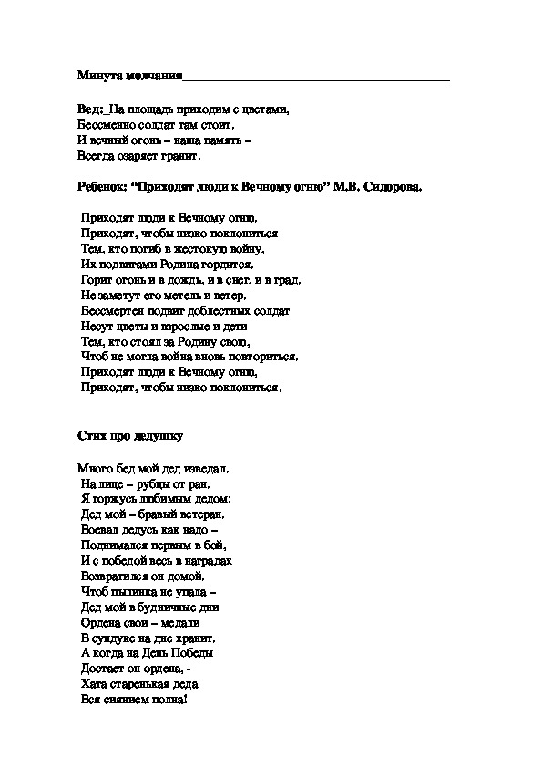 Ребенок: “Приходят люди к Вечному огню” М.В. Сидорова.