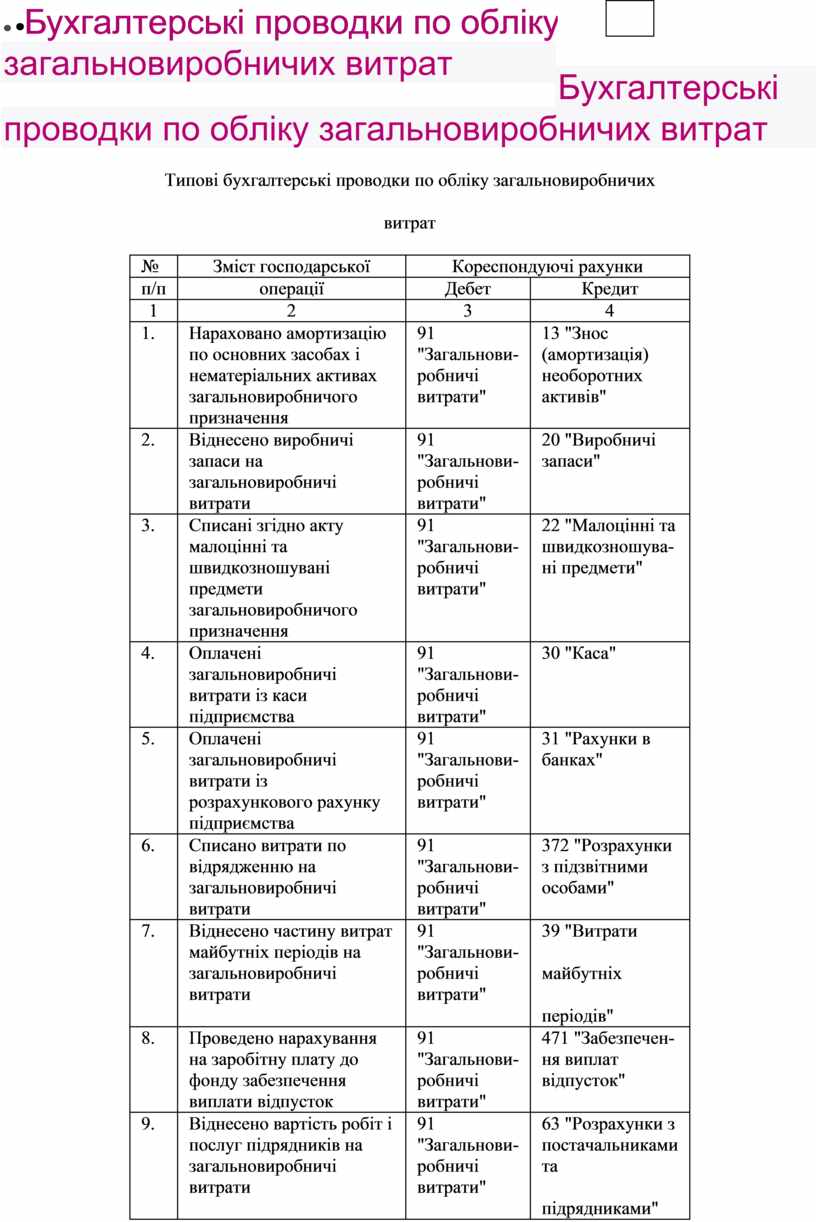 Типові бухгалтерські проводки по обліку загальновиробничих витрат