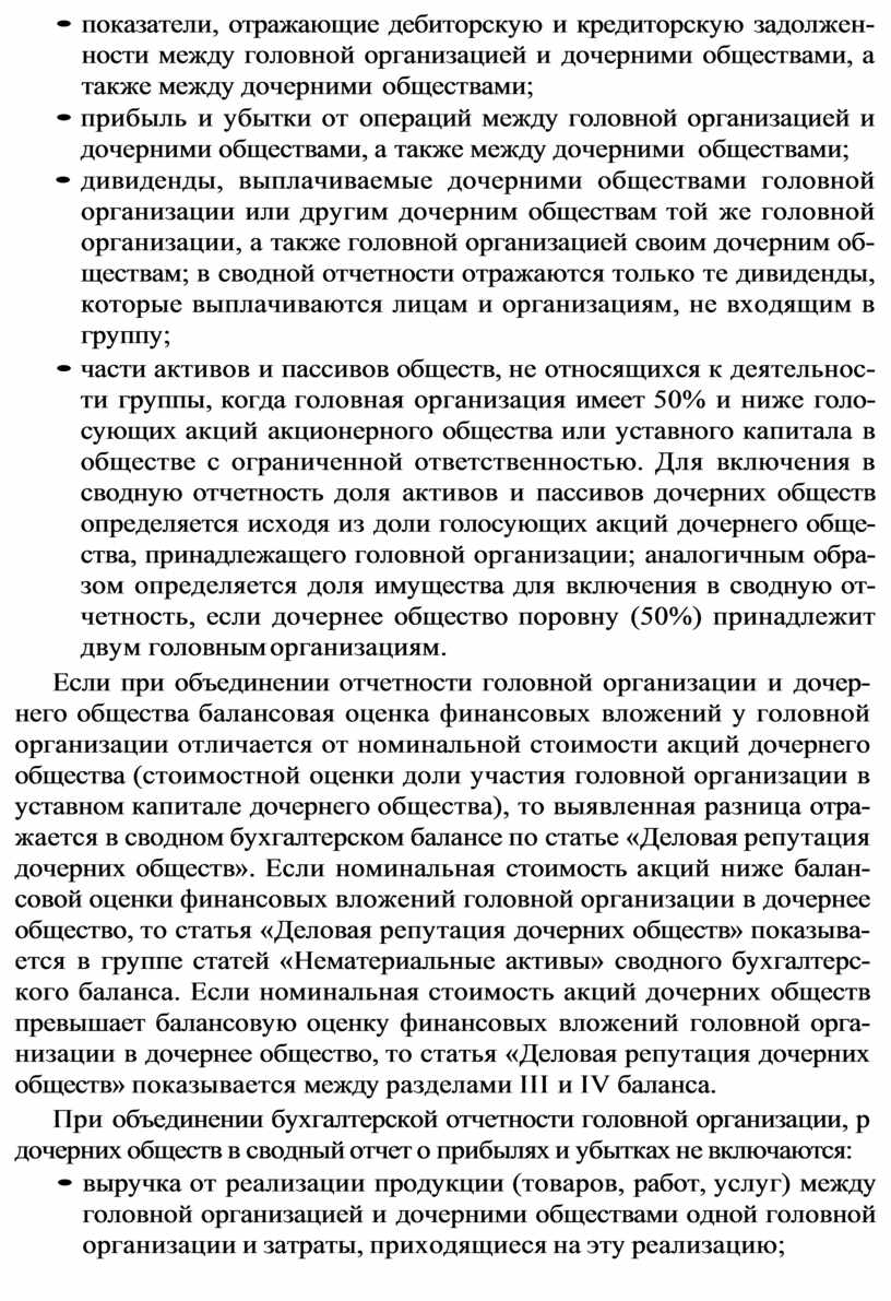 При объединении отчетности головной организации и дочерних об- ществ в сводном бухгалтерском балансе и сводном отчете о прибылях и убытках выделяются отдельно расчетные показатели, отражающие долю меньшинства соответственно в уставном капитале и финансовых результатах деятельности общества.