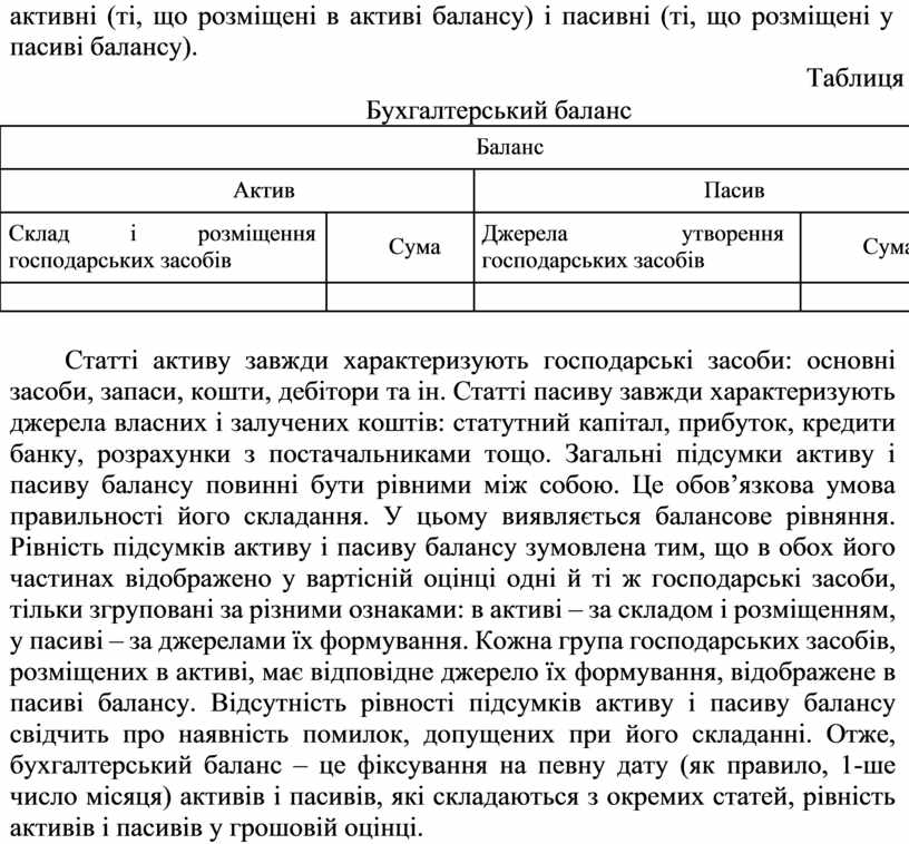За формою баланс – таблиця, на лівій стороні якої відображають склад і розміщення господарських засобів і яка називається активом, а на правій стороні, що називається пасивом, відображають джерела формування господарських засобів. Слова «актив» і «пасив» означають відповідні сторони бухгалтерського балансу.