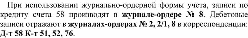 При использовании журнально-ордерной формы учета, записи по кредиту счета 58 производят в журнале-ордере № 8. Дебетовые записи отражают в журналах-ордерах № 2, 2/1, 8 в корреспонденции: Д-т 58 К-т 51, 52, 76.