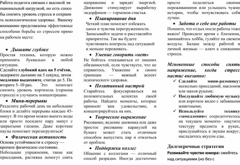 Работа педагога связана с высокой эмоциональной нагрузкой, но есть способы снизить уровень стресса и сохранить психологическое здоровье. Вашему вниманию представлены эффективные способами борьбы со стрессом прямо на рабочем месте: