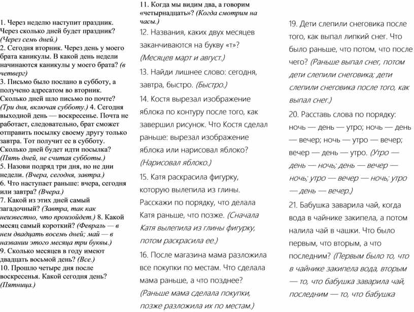 1. Через неделю наступит праздник. Через сколько дней будет праздник? (Через семь дней.) 2. Сегодня вторник. Через день у моего брата каникулы. В какой день недели начинаются каникулы у моего брата? (в четверг) 3. Письмо было послано в субботу, а получено адресатом во вторник. Сколько дней шло письмо по почте? (Три дня, включая субботу.) 4. Сегодня выходной день — воскресенье. Почта не работает, следовательно, брат сможет отправить посылку своему другу только завтра. Тот получит ее в субботу. Сколько дней будет идти посылка? (Пять дней, не считая субботы.) 5. Назови подряд три дня, но не дни недели. (Вчера, сегодня, завтра.) 6. Что наступает раньше: вчера, сегодня или завтра? (Вчера.) 7. Какой из этих дней самый загадочный? (Завтра, так как неизвестно, что произойдет.) 8. Какой месяц самый короткий? (Февраль — в нем двадцать восемь дней; май — в названии этого месяца три буквы.) 9. Сколько месяцев в году имеют двадцать восьмой день? (Все.) 10. Прошло четыре дня после воскресенья. Какой сегодня день? (Пятница.)