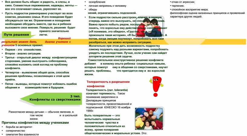 толерантности • гендерная – уважительное отношение к противоположному Подростковые конфликты и