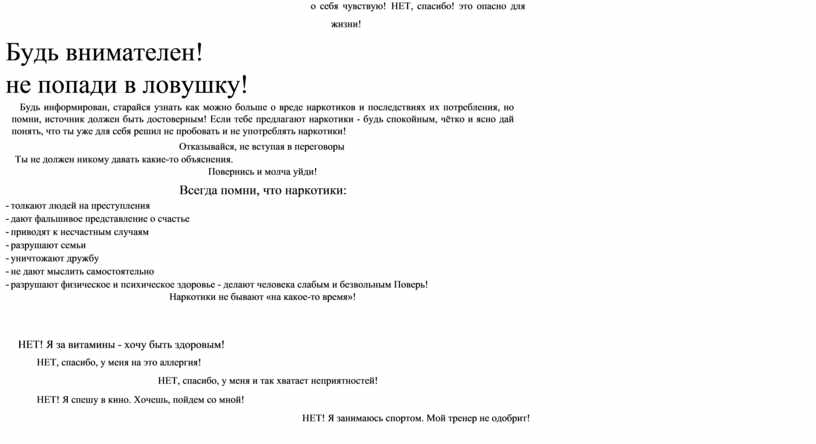 Будь информирован, старайся узнать как можно больше о вреде наркотиков и последствиях их потребления, но помни, источник должен быть достоверным! Если тебе предлагают наркотики - будь спокойным, чётко и ясно дай понять, что ты уже для себя решил не пробовать и не употреблять наркотики!