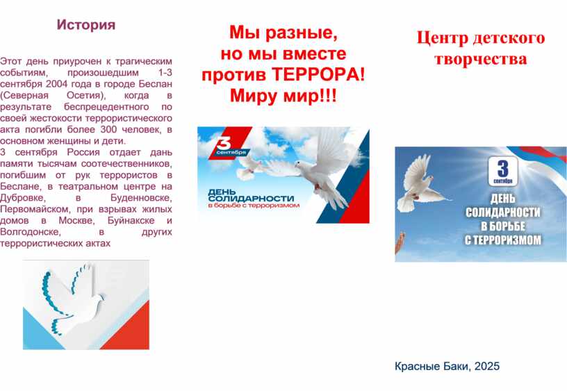 3 сентября Россия отдает дань памяти тысячам соотечественников, погибшим от рук террористов в Беслане, в театральном центре на Дубровке, в Буденновске, Первомайском, при взрывах жилых домов в Москве, Буйнакске и Волгодонске, в других террористических актах