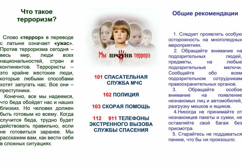 Слово «террор» в переводе с латыни означает «ужас». Против терроризма сегодня – весь мир, люди всех национальностей, стран и континентов. Террористы – это крайне жестокие люди, которые любыми способами хотят запугать нас. Все они – преступники.