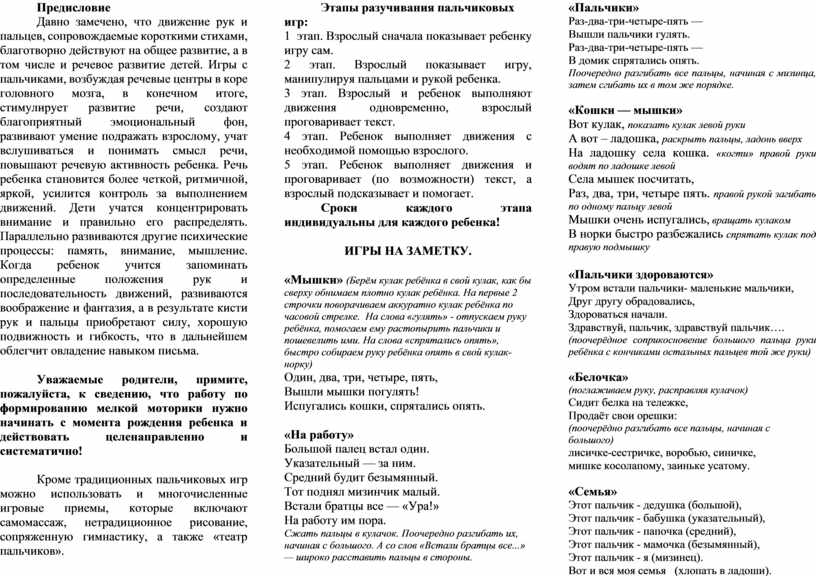 Давно замечено, что движение рук и пальцев, сопровождаемые короткими стихами, благотворно действуют на общее развитие, а в том числе и речевое развитие детей. Игры с пальчиками, возбуждая речевые центры в коре головного мозга, в конечном итоге, стимулирует развитие речи, создают благоприятный эмоциональный фон, развивают умение подражать взрослому, учат вслушиваться и понимать смысл речи, повышают речевую активность ребенка. Речь ребенка становится более четкой, ритмичной, яркой, усилится контроль за выполнением движений. Дети учатся концентрировать внимание и правильно его распределять. Параллельно развиваются другие психические процессы: память, внимание, мышление. Когда ребенок учится запоминать определенные положения рук и последовательность движений, развиваются воображение и фантазия, а в результате кисти рук и пальцы приобретают силу, хорошую подвижность и гибкость, что в дальнейшем облегчит овладение навыком письма.