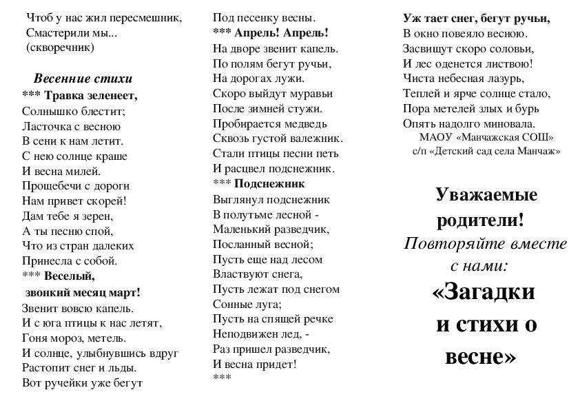 Буклет содержит подборку стихов и загадок о времени года весна.