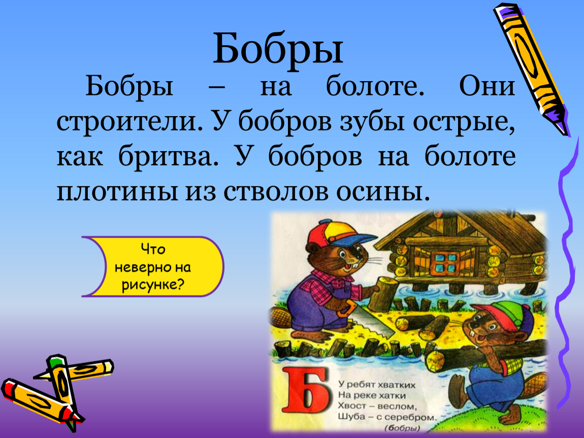 Бобры – на болоте. Они строители. У бобров зубы острые, как бритва. У бобров на болоте плотины из стволов осины.