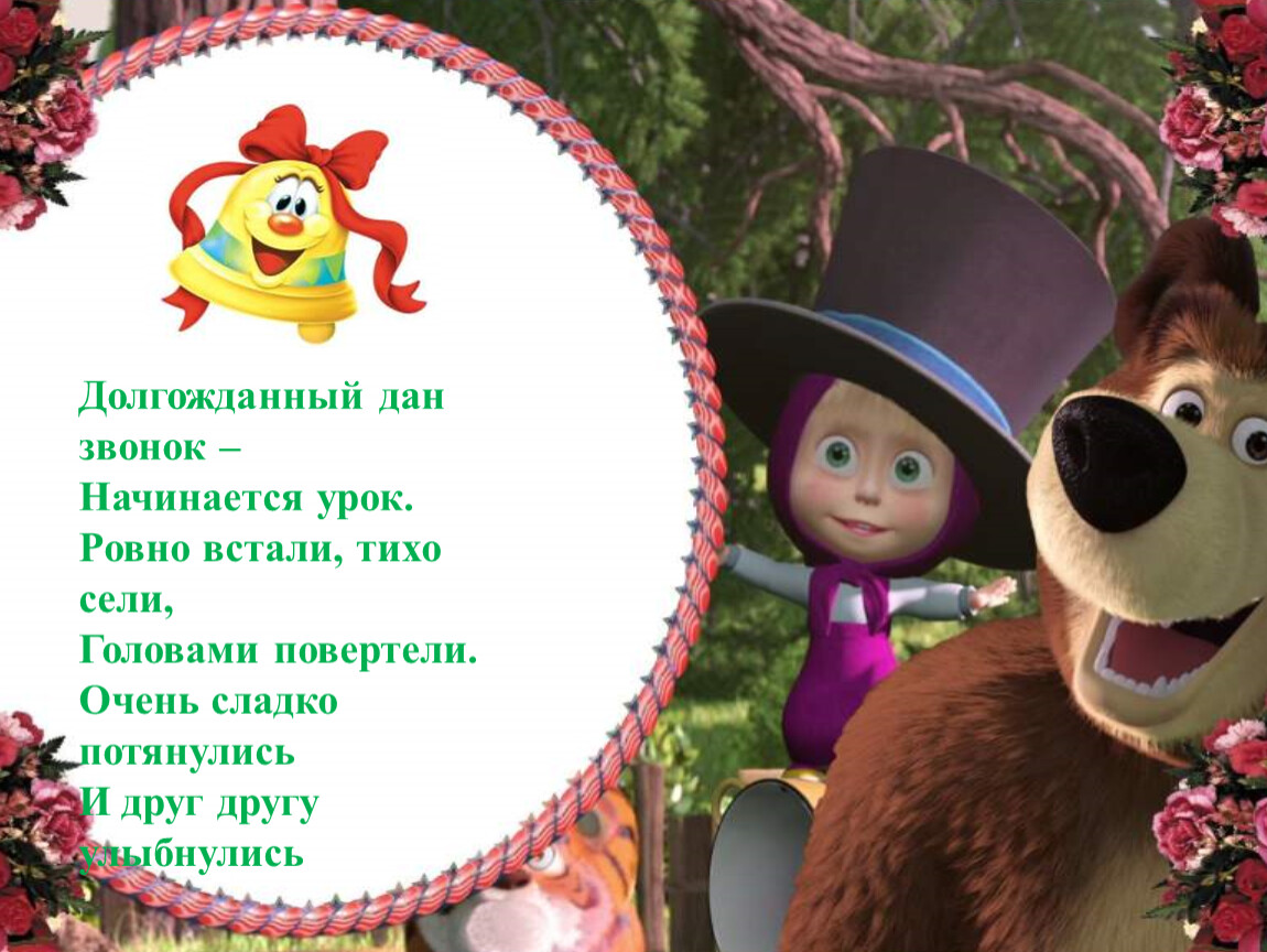 Долгожданный дан звонок –Начинается урок.Ровно встали, тихо сели,