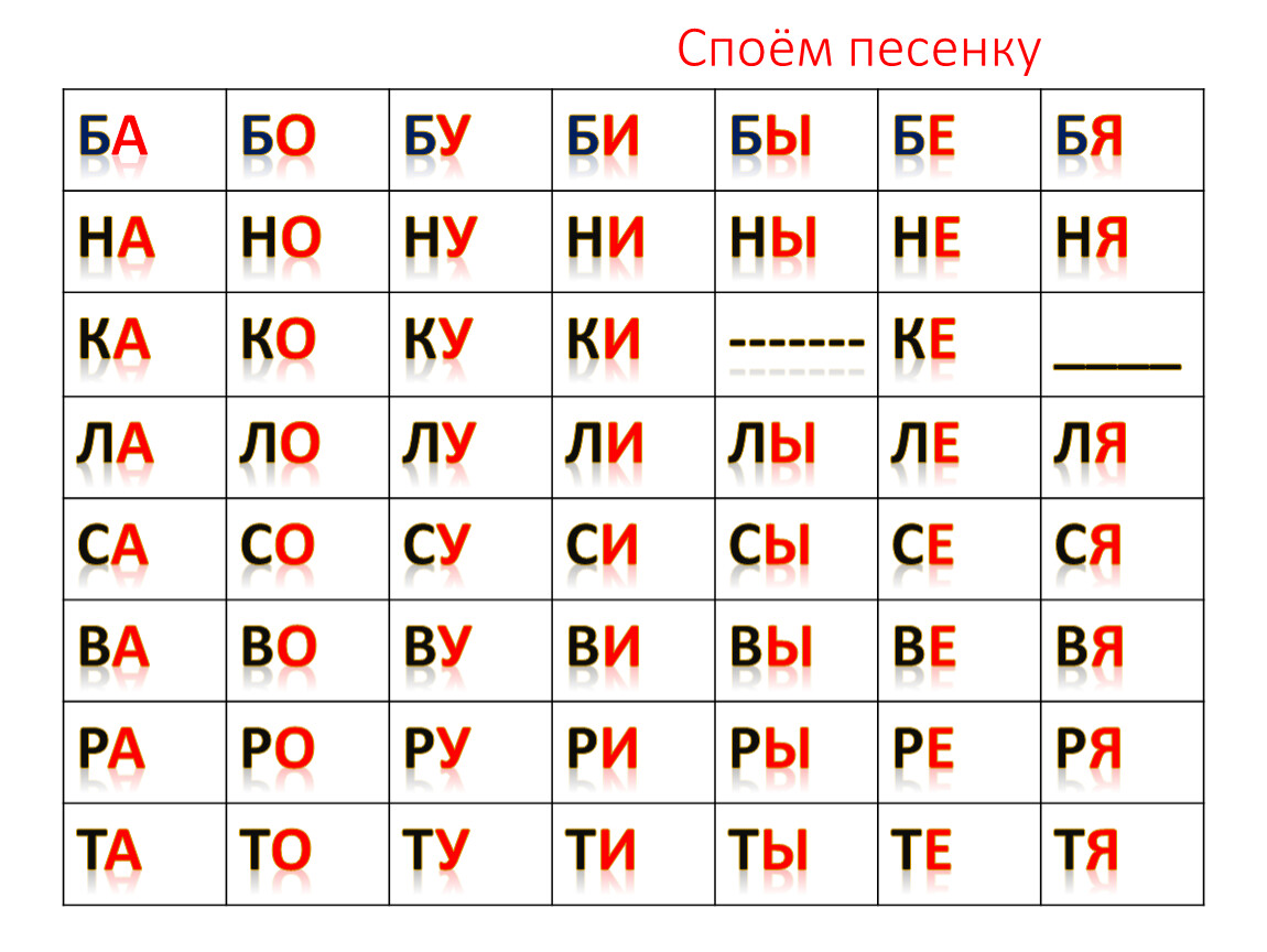 Ба | бо | Бу | Би | Бы | Бе | Бя |
