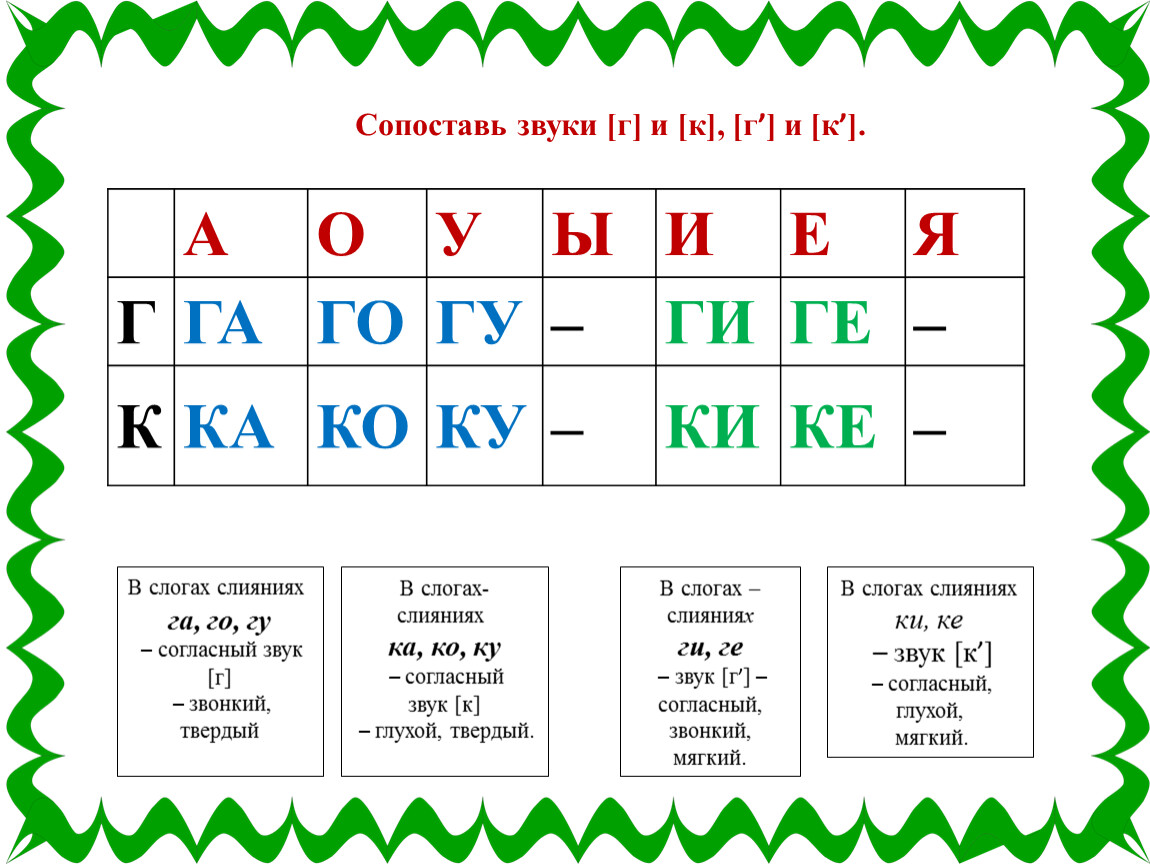 Сопоставь звуки [г] и [к], [г’] и [к’].