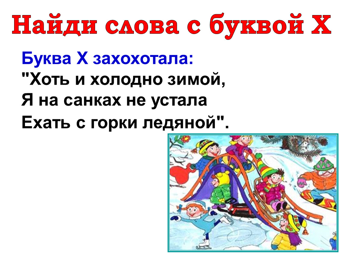 Буква Х захохотала: "Хоть и холодно зимой, Я на санках не устала Ехать с горки ледяной".