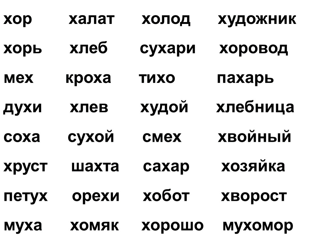 хор халат холод художник хорь хлеб сухари хоровод мех кроха тихо пахарь духи хлев худой хлебница соха сухой смех хвойный хруст шахта сахар хозяйка петух орехи хобот хворост муха хомяк хорошо мухомор