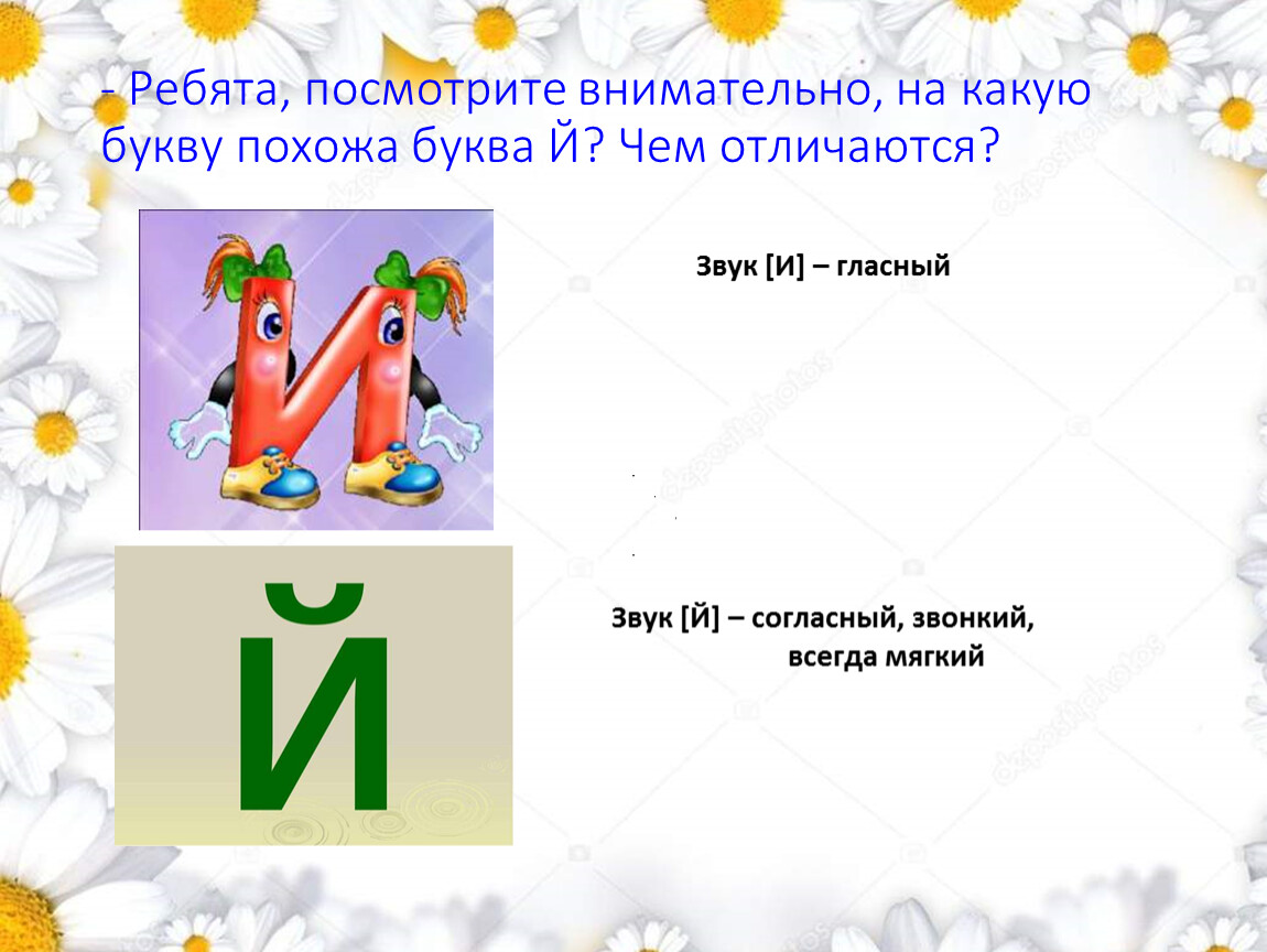 - Ребята, посмотрите внимательно, на какую букву похожа буква Й? Чем отличаются?