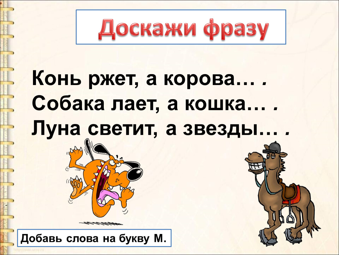 Конь ржет, а корова… .Собака лает, а кошка… .Луна светит, а звезды… .