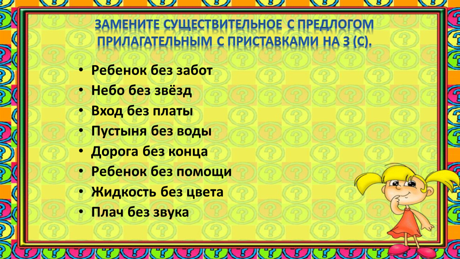 Замените существительное с предлогом прилагательным с приставками на з (с).