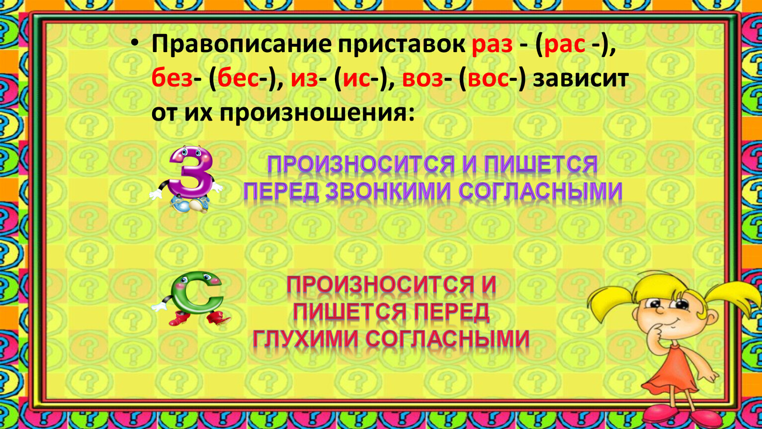 Правописание приставок раз - (рас -), без- (бес-), из- (ис-), воз- (вос-) зависит от их произношения: