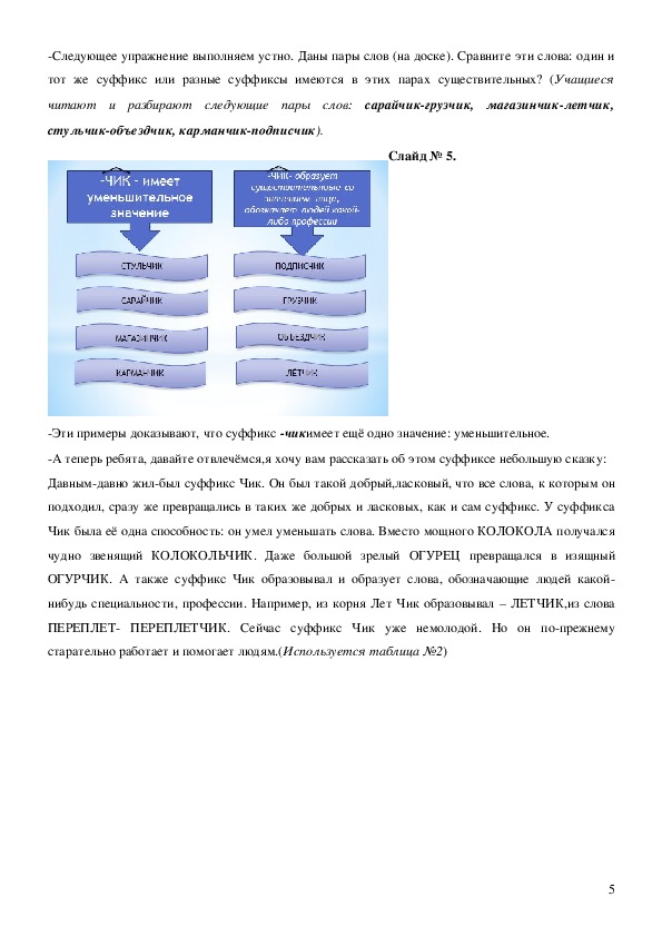 написания суффиксов –чик, щик; обратить внимание учащихся ещё на одну функцию суффикса –