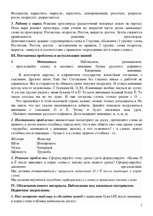 1. Рассмотрите таблицу и сделайте вывод о написании букв О/Ё после шипящих