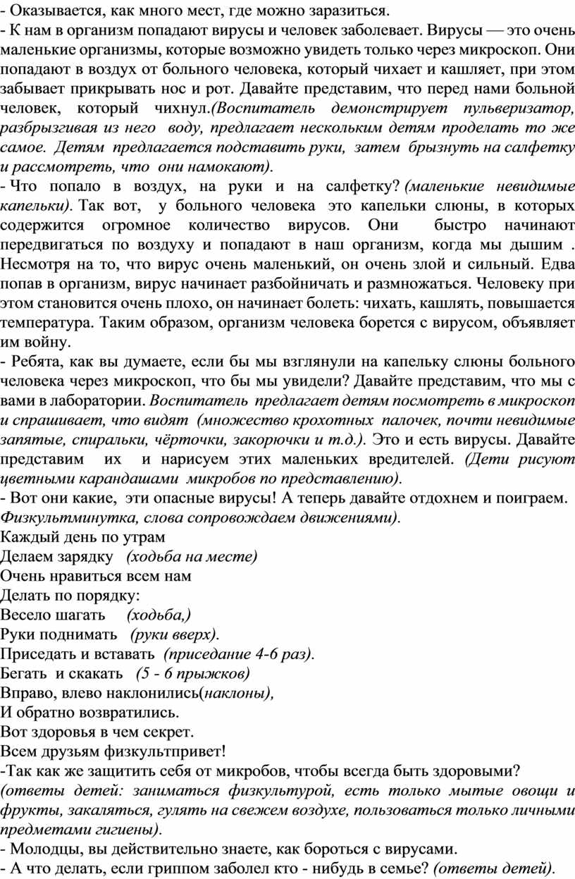 - Что попало в воздух, на руки и на салфетку? (маленькие невидимые капельки). Так вот, у больного человека это капельки слюны, в которых содержится огромное количество вирусов. Они быстро начинают передвигаться по воздуху и попадают в наш организм, когда мы дышим . Несмотря на то, что вирус очень маленький, он очень злой и сильный. Едва попав в организм, вирус начинает разбойничать и размножаться. Человеку при этом становится очень плохо, он начинает болеть: чихать, кашлять, повышается температура. Таким образом, организм человека борется с вирусом, объявляет им войну.