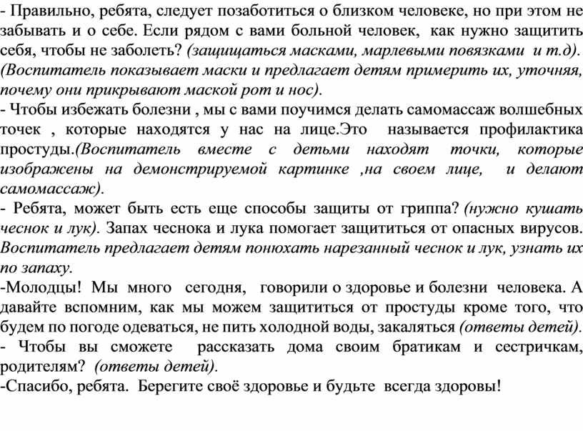 - Правильно, ребята, следует позаботиться о близком человеке, но при этом не забывать и о себе. Если рядом с вами больной человек, как нужно защитить себя, чтобы не заболеть? (защищаться масками, марлевыми повязками и т.д).
