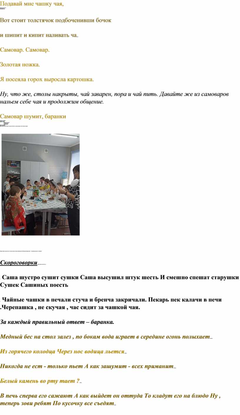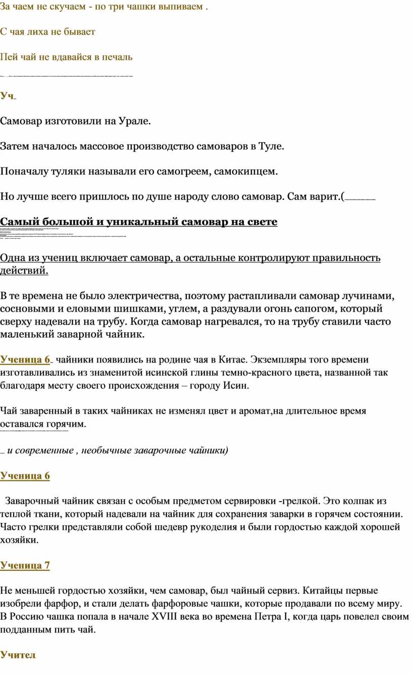 Ангелина.По русской традиции участники чаепития усаживаются за стол до того, как будет готов чай. Это время предварительных бесед и легких закусок – пирогов, яблок и т.д. Давайте и мы сядем за столы и будем вести беседу.
