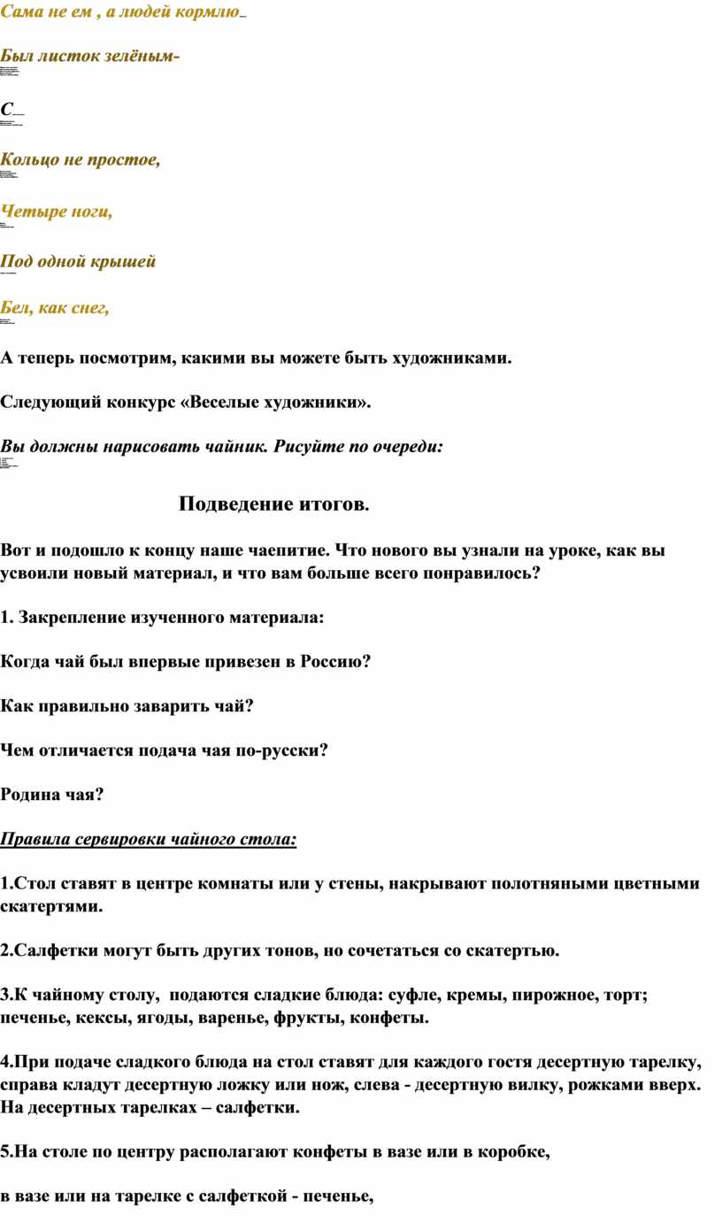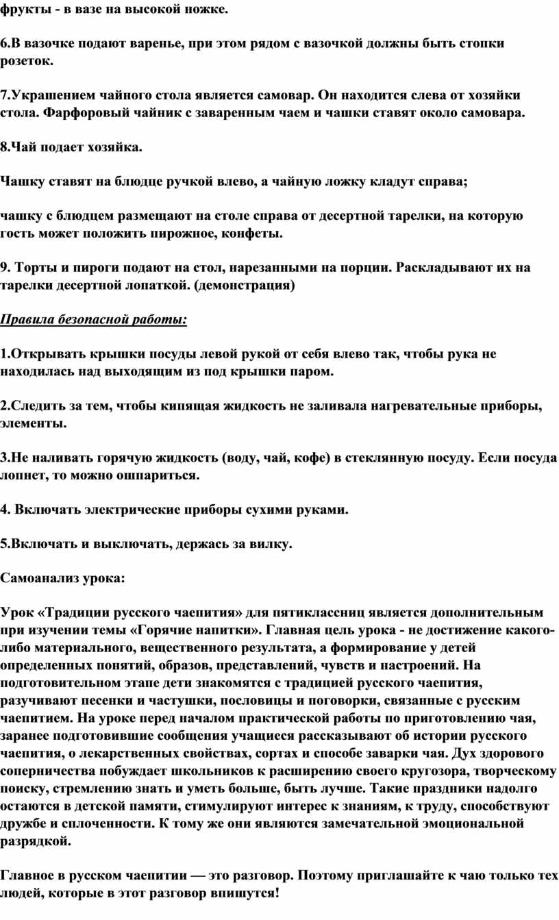 Урок «Традиции русского чаепития» для пятиклассниц является дополнительным при изучении темы «Горячие напитки». Главная цель урока - не достижение какого-либо материального, вещественного результата, а формирование у детей определенных понятий, образов, представлений, чувств и настроений. На подготовительном этапе дети знакомятся с традицией русского чаепития, разучивают песенки и частушки, пословицы и поговорки, связанные с русским чаепитием. На уроке перед началом практической работы по приготовлению чая, заранее подготовившие сообщения учащиеся рассказывают об истории русского чаепития, о лекарственных свойствах, сортах и способе заварки чая. Дух здорового соперничества побуждает школьников к расширению своего кругозора, творческому поиску, стремлению знать и уметь больше, быть лучше. Такие праздники надолго остаются в детской памяти, стимулируют интерес к знаниям, к труду, способствуют дружбе и сплоченности. К тому же они являются замечательной эмоциональной разрядкой.