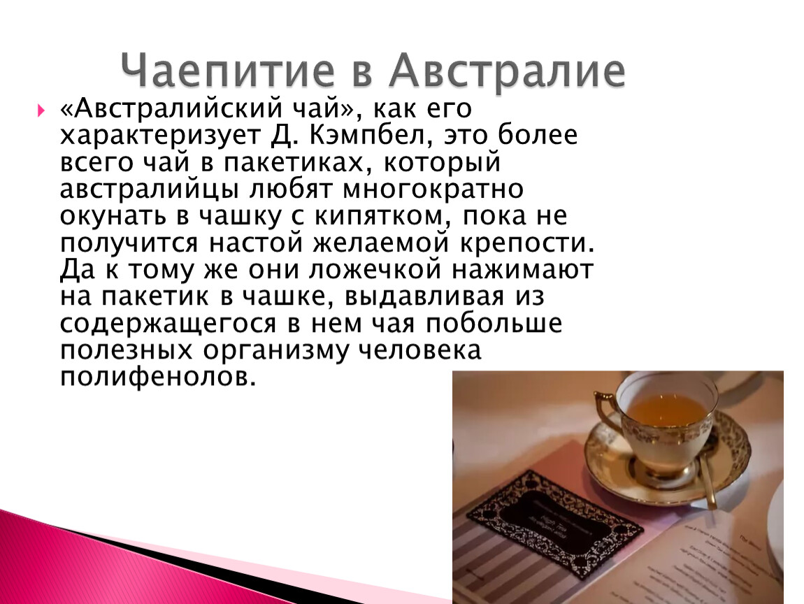 «Австралийский чай», как его характеризует Д. Кэмпбел, это более всего чай в пакетиках, который австралийцы любят многократно окунать в чашку с кипятком, пока не получится настой желаемой крепости. Да к тому же они ложечкой нажимают на пакетик в чашке, выдавливая из содержащегося в нем чая побольше полезных организму человека полифенолов.