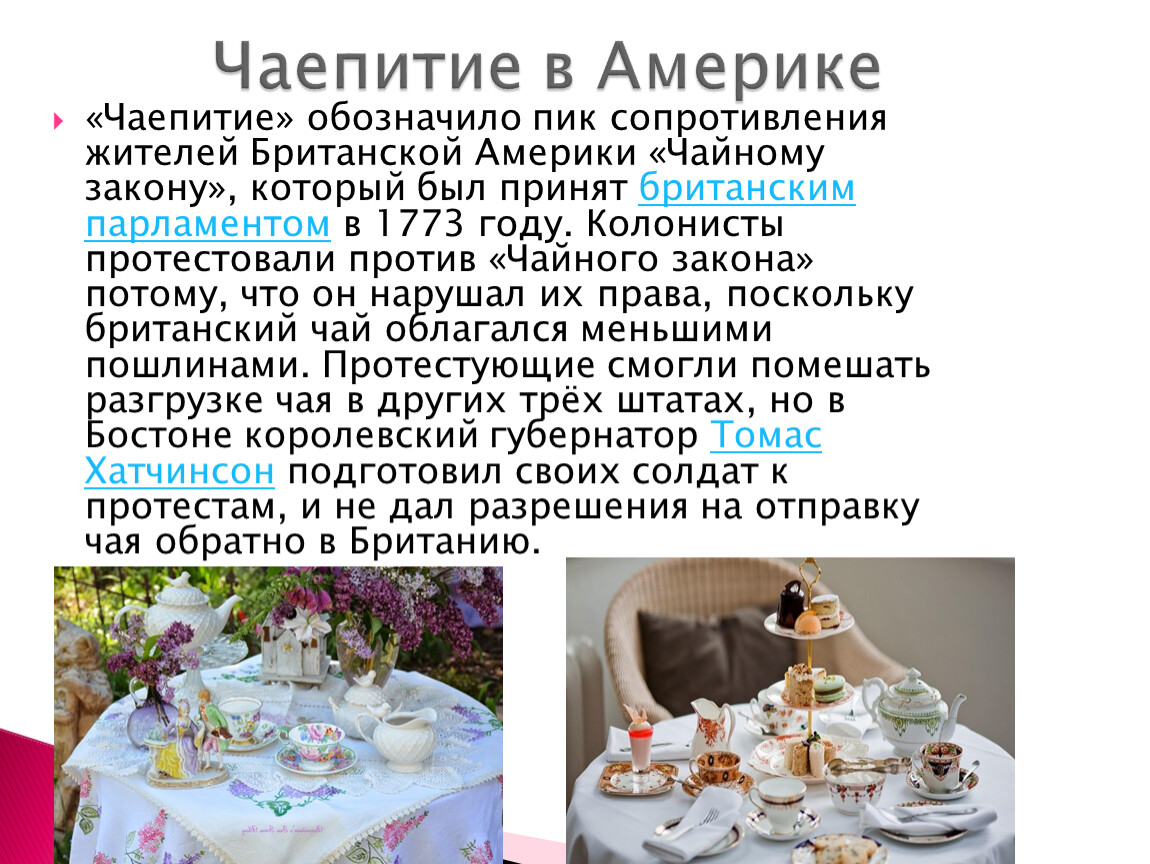 «Чаепитие» обозначило пик сопротивления жителей Британской Америки «Чайному закону», который был принят британским парламентом в 1773 году. Колонисты протестовали против «Чайного закона» потому, что он нарушал их правa, поскольку британский чай облагался меньшими пошлинами. Протестующие смогли помешать разгрузке чая в других трёх штатах, но в Бостоне королевский губернатор Томас Хатчинсон подготовил своих солдат к протестам, и не дал разрешения на отправку чая обратно в Британию.