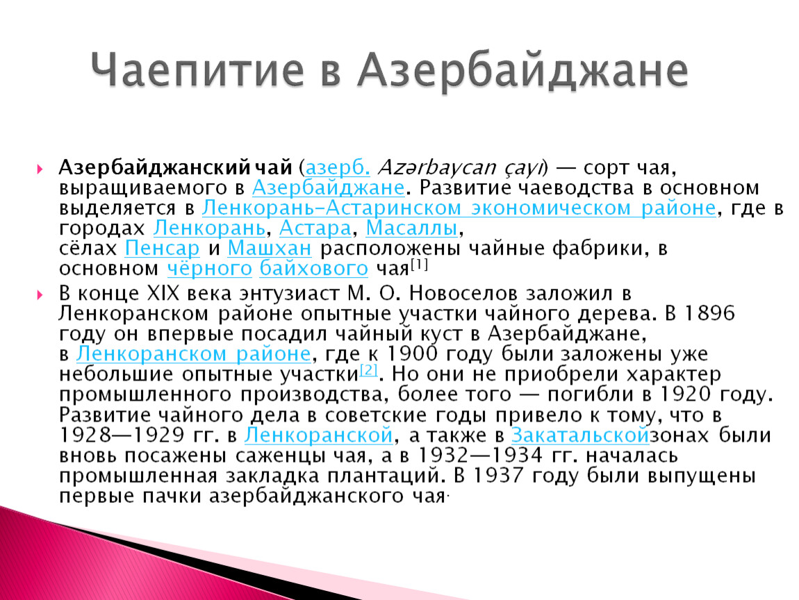В конце XIX века энтузиаст М. О. Новоселов заложил в Ленкоранском районе опытные участки чайного дерева. В 1896 году он впервые посадил чайный куст в Азербайджане, в Ленкоранском районе, где к 1900 году были заложены уже небольшие опытные участки[2]. Но они не приобрели характер промышленного производства, более того — погибли в 1920 году. Развитие чайного дела в советские годы привело к тому, что в 1928—1929 гг. в Ленкоранской, а также в Закатальскойзонах были вновь посажены саженцы чая, а в 1932—1934 гг. началась промышленная закладка плантаций. В 1937 году были выпущены первые пачки азербайджанского чая.