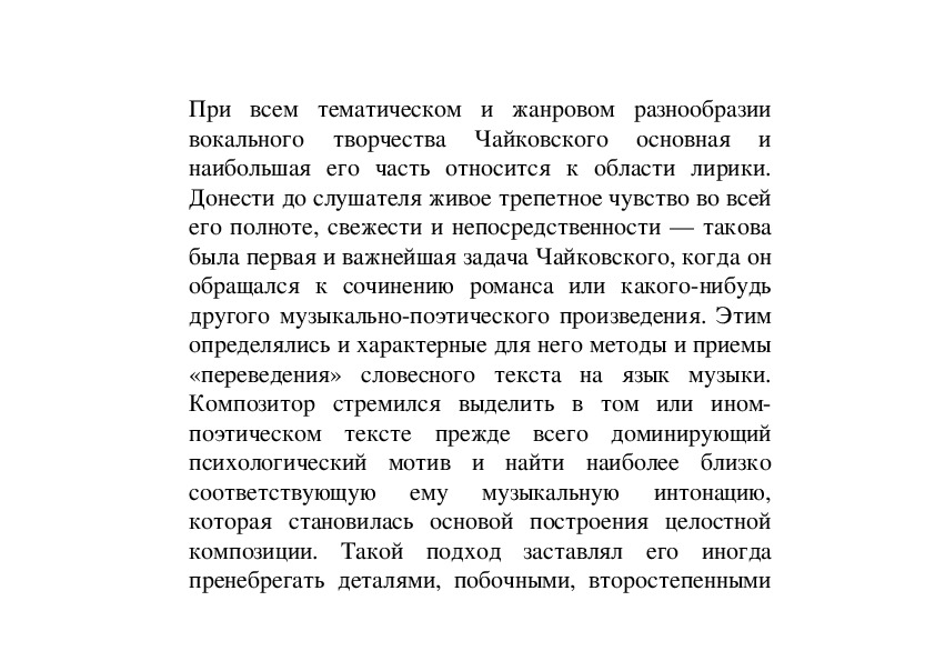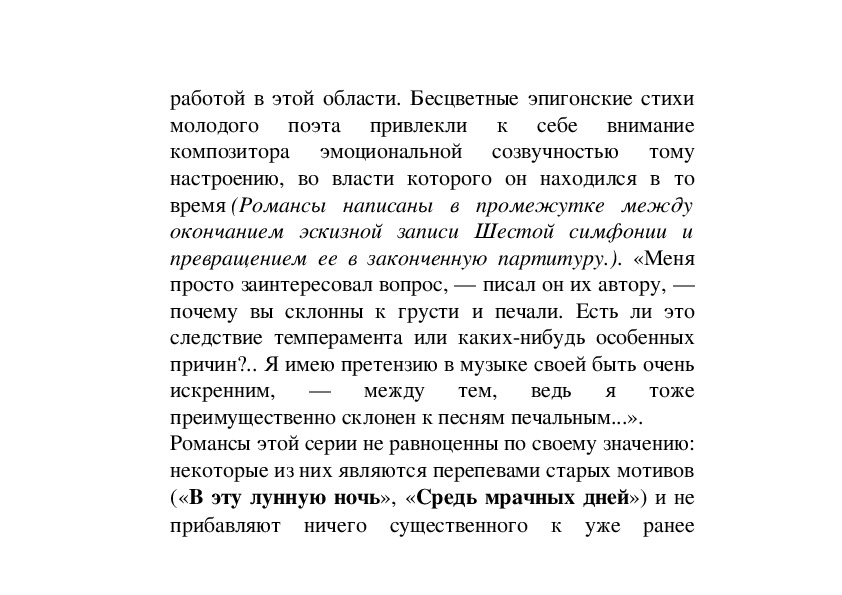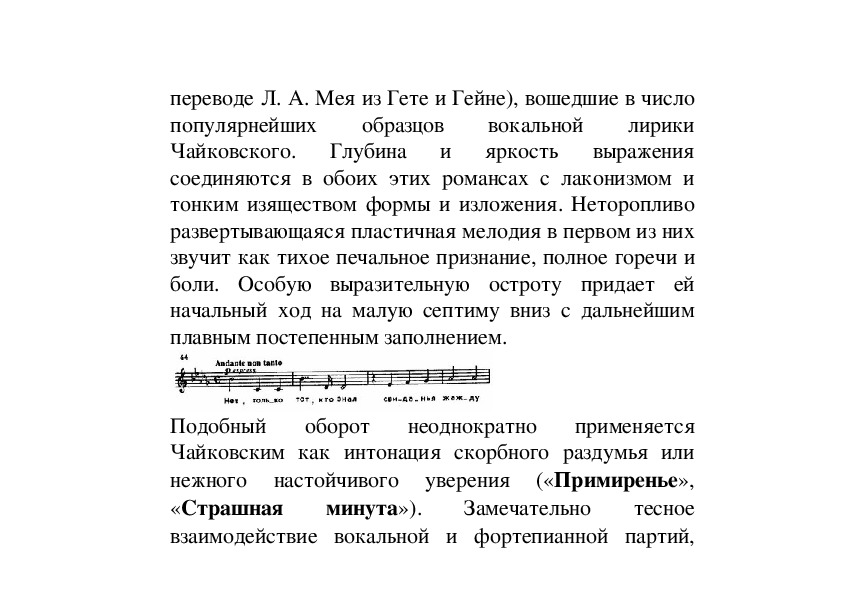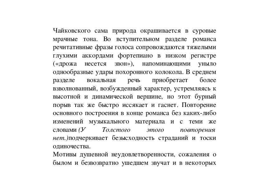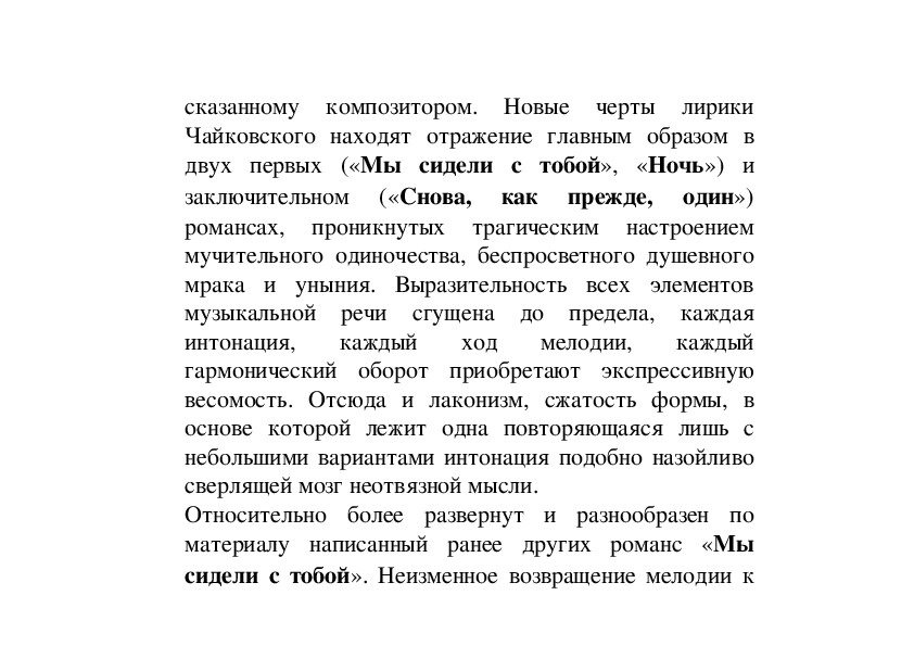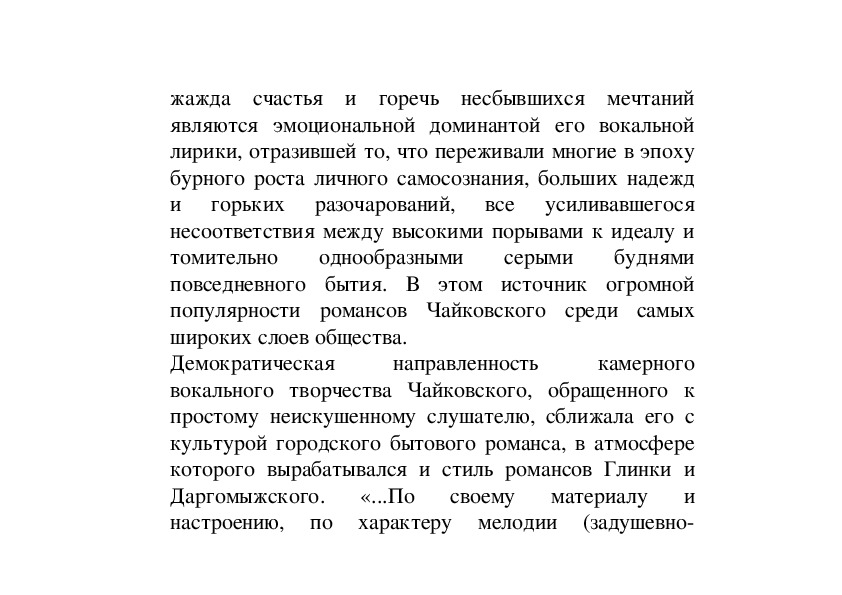Камерное вокальное творчество было для Чайковского своего рода лирическим дневником, в котором запечатлены многие мотивы, получившие затем более развитое воплощение в его крупных произведениях оперного или симфонического плана. Чувства острого душевного разлада и неудовлетворенности, страстная жажда счастья и горечь несбывшихся мечтаний являются эмоциональной доминантой его вокальной лирики, отразившей то, что переживали многие в эпоху бурного роста личного самосознания, больших надежд и горьких разочарований, все усиливавшегося несоответствия между высокими порывами к идеалу и томительно однообразными серыми буднями повседневного бытия. В этом источник огромной популярности романсов Чайковского среди самых широких слоев общества.