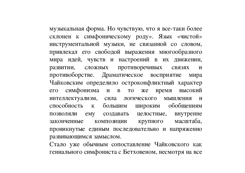Великий художник и мастер широкого кругозора, оставивший огромное по объему богатейшее наследие в самых различных областях музыкального творчества, Чайковский по характеру своего мышления являлся в первую очередь симфонистом. «...Опера, — писал он однажды, — едва ли все-таки не самая богатая музыкальная форма. Но чувствую, что я все-таки более склонен к симфоническому роду». Язык «чистой» инструментальной музыки, не связанной со словом, привлекал его свободой выражения многообразного мира идей, чувств и настроений в их движении, развитии, сложных противоречивых связях и противоборстве. Драматическое восприятие мира Чайковским определило остроконфликтный характер его симфонизма и в то же время высокий интеллектуализм, сила логического мышления и способность к большим широким обобщениям позволяли ему создавать целостные, внутренне законченные композиции крупного масштаба, проникнутые единым последовательно и напряженно развивающимся замыслом.