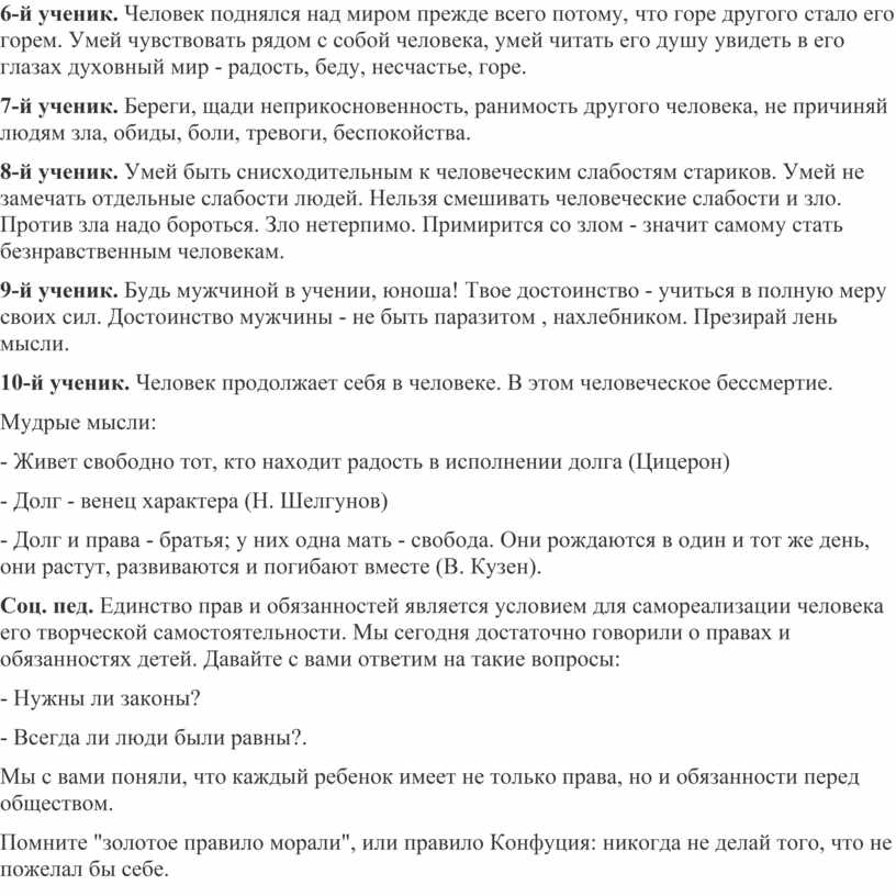 8-й ученик. Умей быть снисходительным к человеческим слабостям стариков. Умей не замечать отдельные слабости людей. Нельзя смешивать человеческие слабости и зло. Против зла надо бороться. Зло нетерпимо. Примирится со злом - значит самому стать безнравственным человекам.
