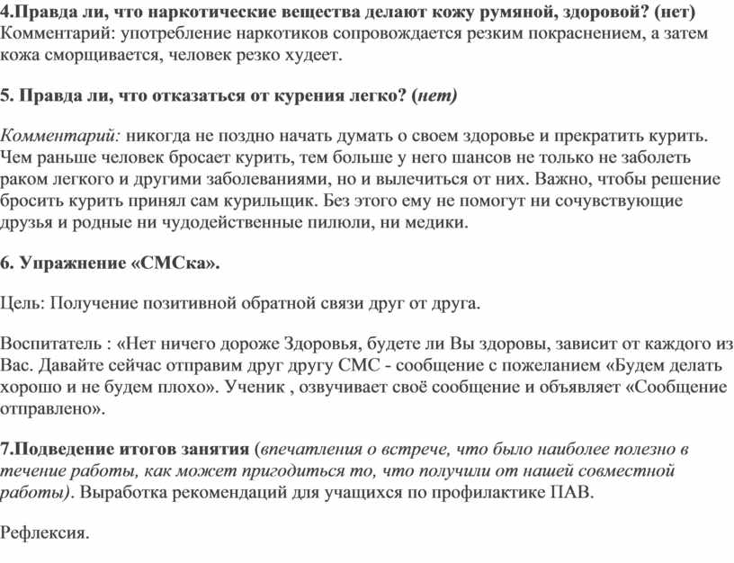 7.Подведение итогов занятия (впечатления о встрече, что было наиболее полезно в течение работы, как может пригодиться то, что получили от нашей совместной работы). Выработка рекомендаций для учащихся по профилактике ПАВ.