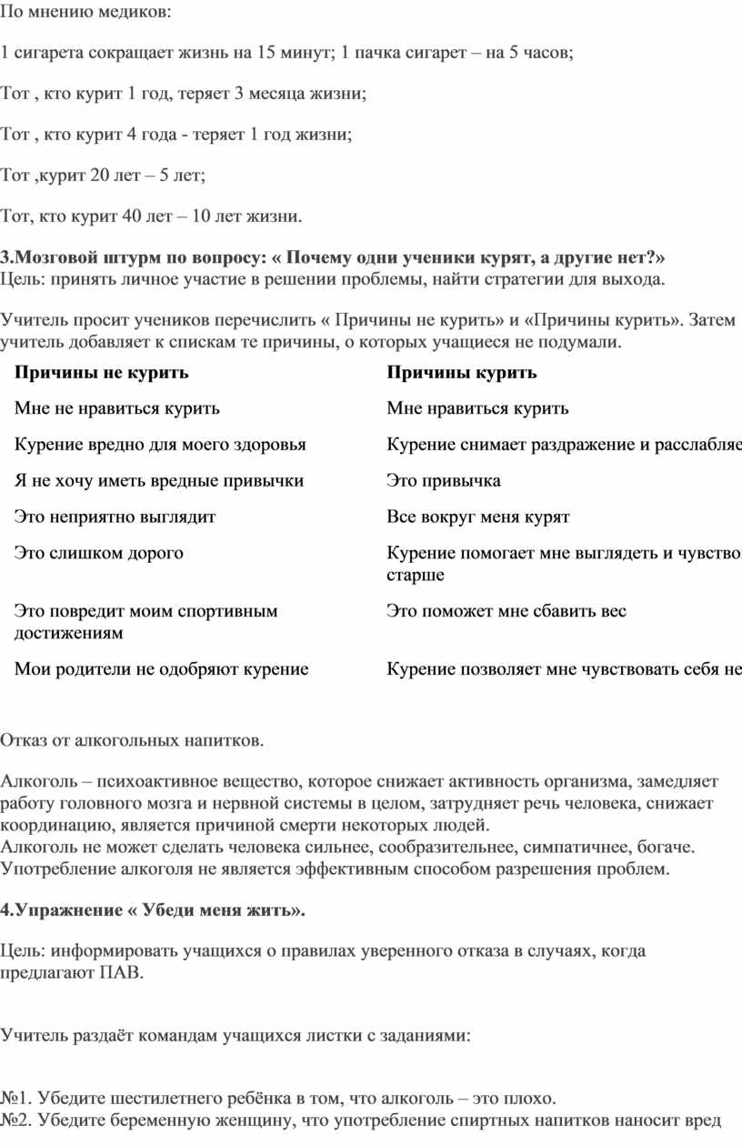 Учитель просит учеников перечислить « Причины не курить» и «Причины курить». Затем учитель добавляет к спискам те причины, о которых учащиеся не подумали.