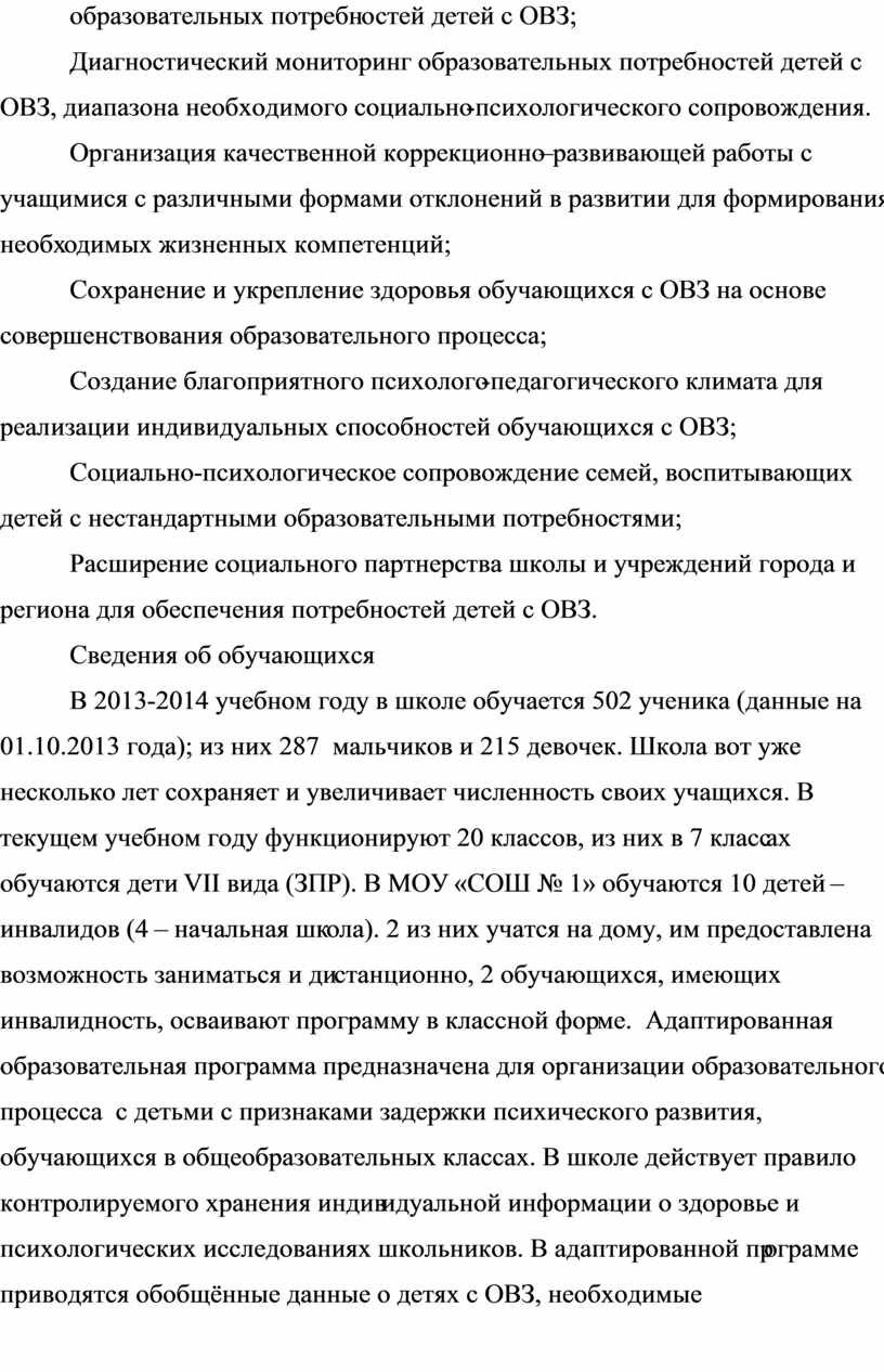 В 2013-2014 учебном году в школе обучается 502 ученика (данные на 01.10.2013 года); из них 287 мальчиков и 215 девочек. Школа вот уже несколько лет сохраняет и увеличивает численность своих учащихся. В текущем учебном году функционируют 20 классов, из них в 7 классах обучаются дети VII вида (ЗПР). В МОУ «СОШ № 1» обучаются 10 детей – инвалидов (4 – начальная школа). 2 из них учатся на дому, им предоставлена возможность заниматься и дистанционно, 2 обучающихся, имеющих инвалидность, осваивают программу в классной форме. Адаптированная образовательная программа предназначена для организации образовательного процесса с детьми с признаками задержки психического развития, обучающихся в общеобразовательных классах. В школе действует правило контролируемого хранения индивидуальной информации о здоровье и психологических исследованиях школьников. В адаптированной программе приводятся обобщённые данные о детях с ОВЗ, необходимые