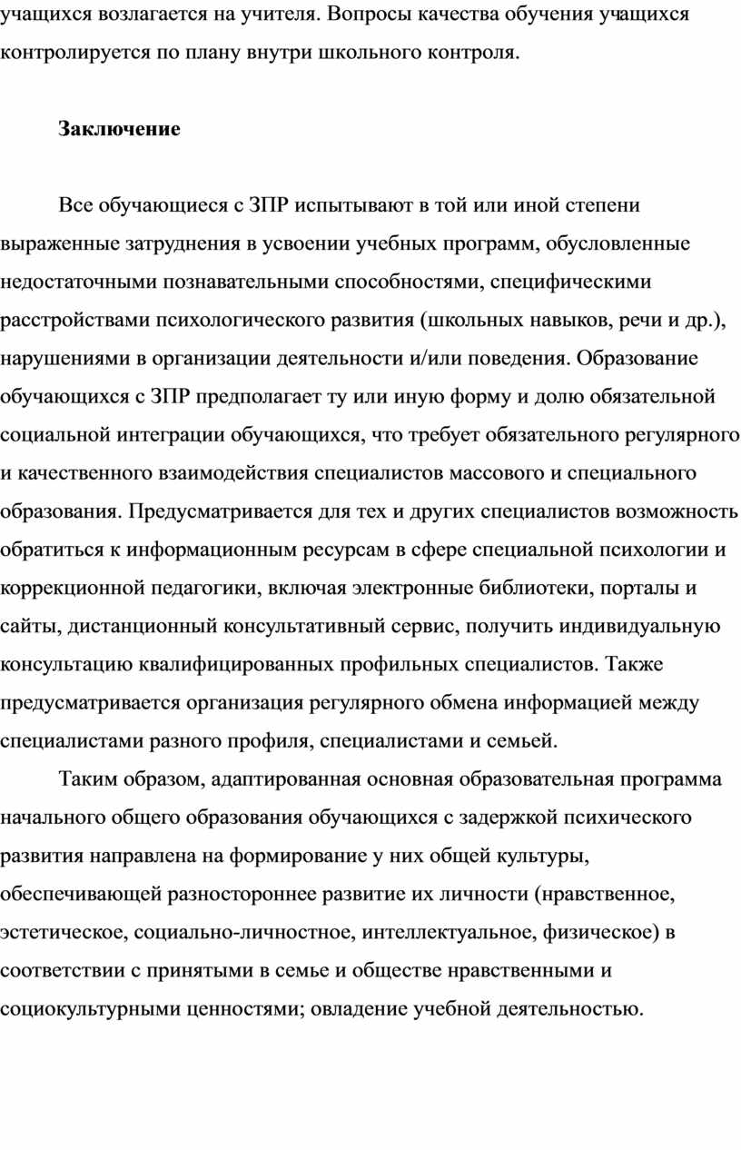 Все обучающиеся с ЗПР испытывают в той или иной степени выраженные затруднения в усвоении учебных программ, обусловленные недостаточными познавательными способностями, специфическими расстройствами психологического развития (школьных навыков, речи и др.), нарушениями в организации деятельности и/или поведения. Образование обучающихся с ЗПР предполагает ту или иную форму и долю обязательной социальной интеграции обучающихся, что требует обязательного регулярного и качественного взаимодействия специалистов массового и специального образования. Предусматривается для тех и других специалистов возможность обратиться к информационным ресурсам в сфере специальной психологии и коррекционной педагогики, включая электронные библиотеки, порталы и сайты, дистанционный консультативный сервис, получить индивидуальную консультацию квалифицированных профильных специалистов. Также предусматривается организация регулярного обмена информацией между специалистами разного профиля, специалистами и семьей.