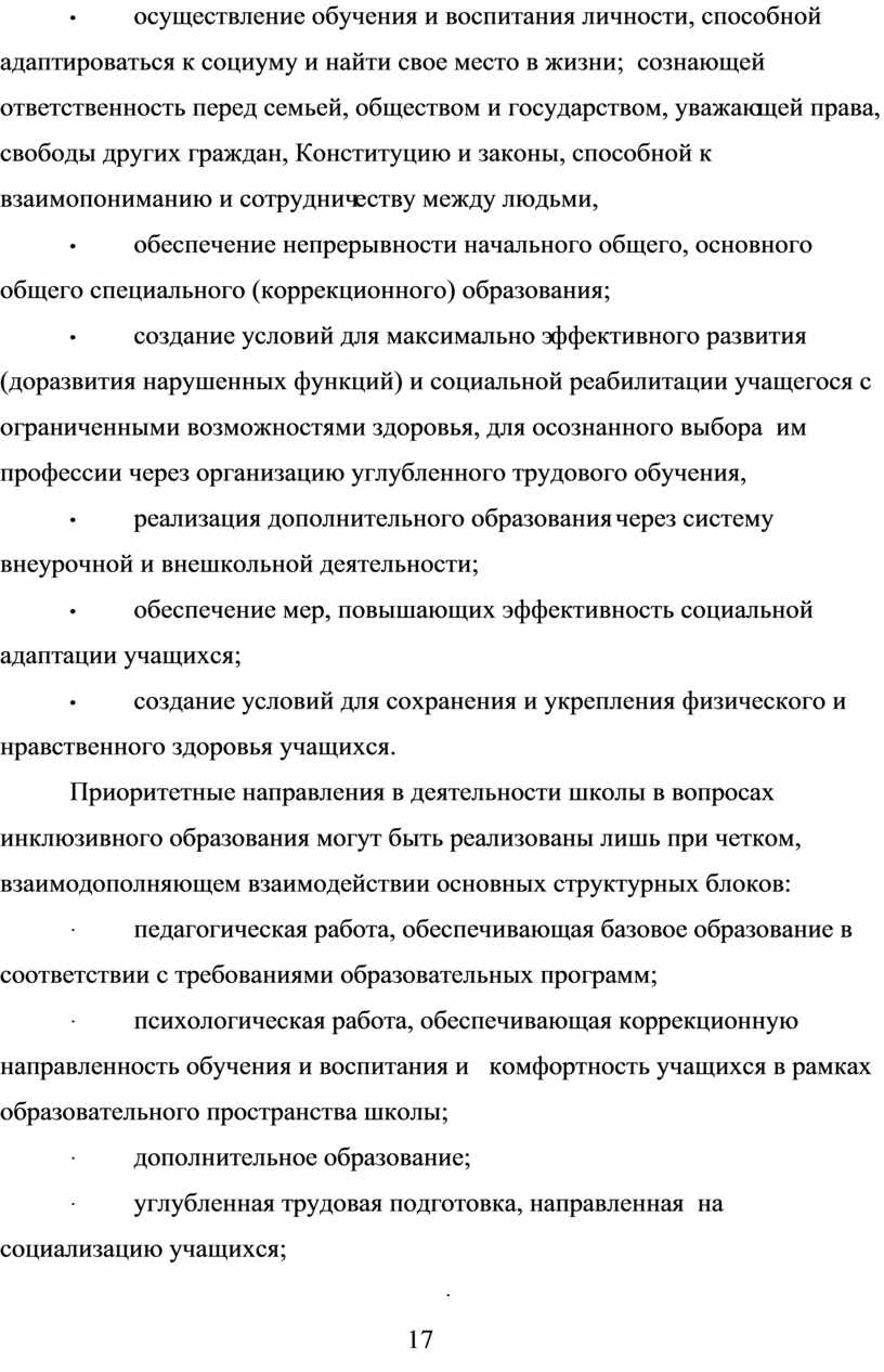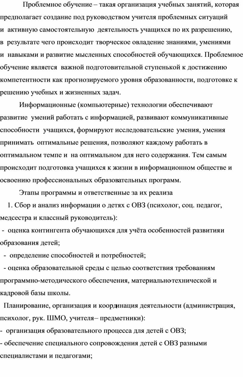 Организационно-педагогические условия, технологии образовательного процесса.Организация действий по адаптированной образовательной программе опирается на положение о том, что главной целью образовательного процесса для детей с ОВЗ в адаптивной школе является не только получение ими качественного образования, но и максимальное социальное включение, интеграция в окружающий мир, развитие жизненной компетенции.