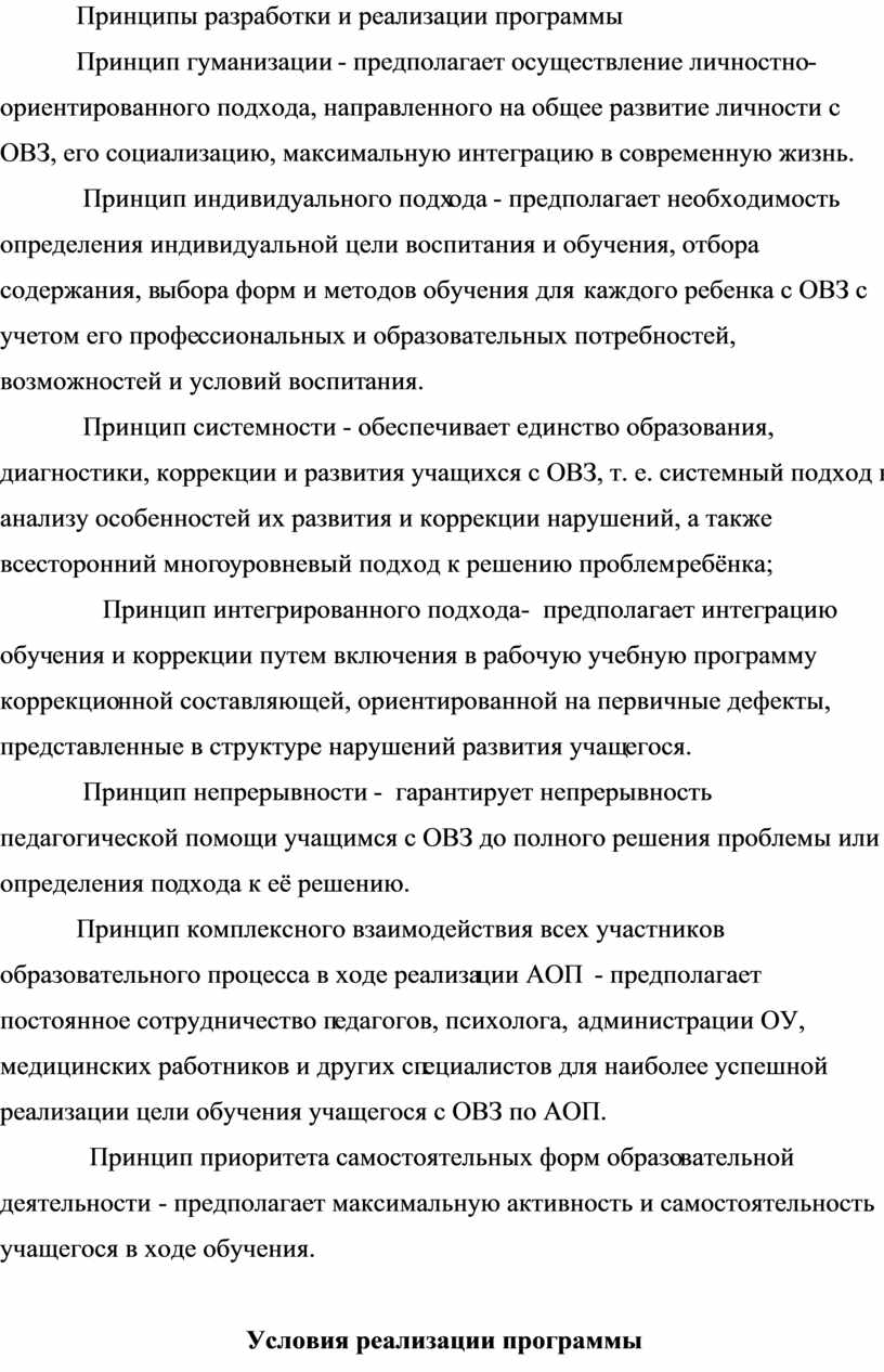 Принцип индивидуального подхода - предполагает необходимость определения индивидуальной цели воспитания и обучения, отбора содержания, выбора форм и методов обучения для каждого ребенка с ОВЗ с учетом его профессиональных и образовательных потребностей, возможностей и условий воспитания.
