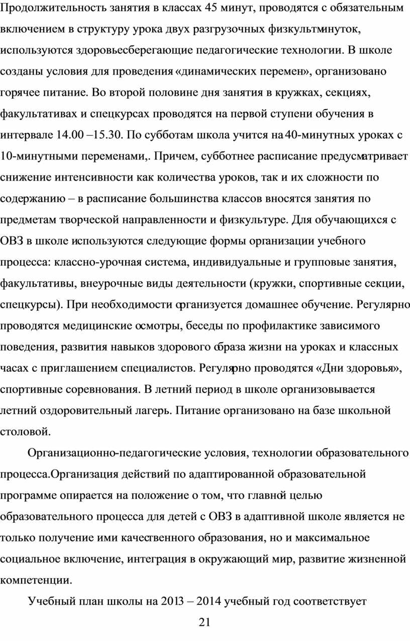 10-минутными переменами,. Причем, субботнее расписание предусматривает снижение интенсивности как количества уроков, так и их сложности по содержанию – в расписание большинства классов вносятся занятия по предметам творческой направленности и физкультуре. Для обучающихся с ОВЗ в школе используются следующие формы организации учебного процесса: классно-урочная система, индивидуальные и групповые занятия, факультативы, внеурочные виды деятельности (кружки, спортивные секции, спецкурсы). При необходимости организуется домашнее обучение. Регулярно проводятся медицинские осмотры, беседы по профилактике зависимого поведения, развития навыков здорового образа жизни на уроках и классных часах с приглашением специалистов. Регулярно проводятся «Дни здоровья», спортивные соревнования. В летний период в школе организовывается летний оздоровительный лагерь. Питание организовано на базе школьной столовой.