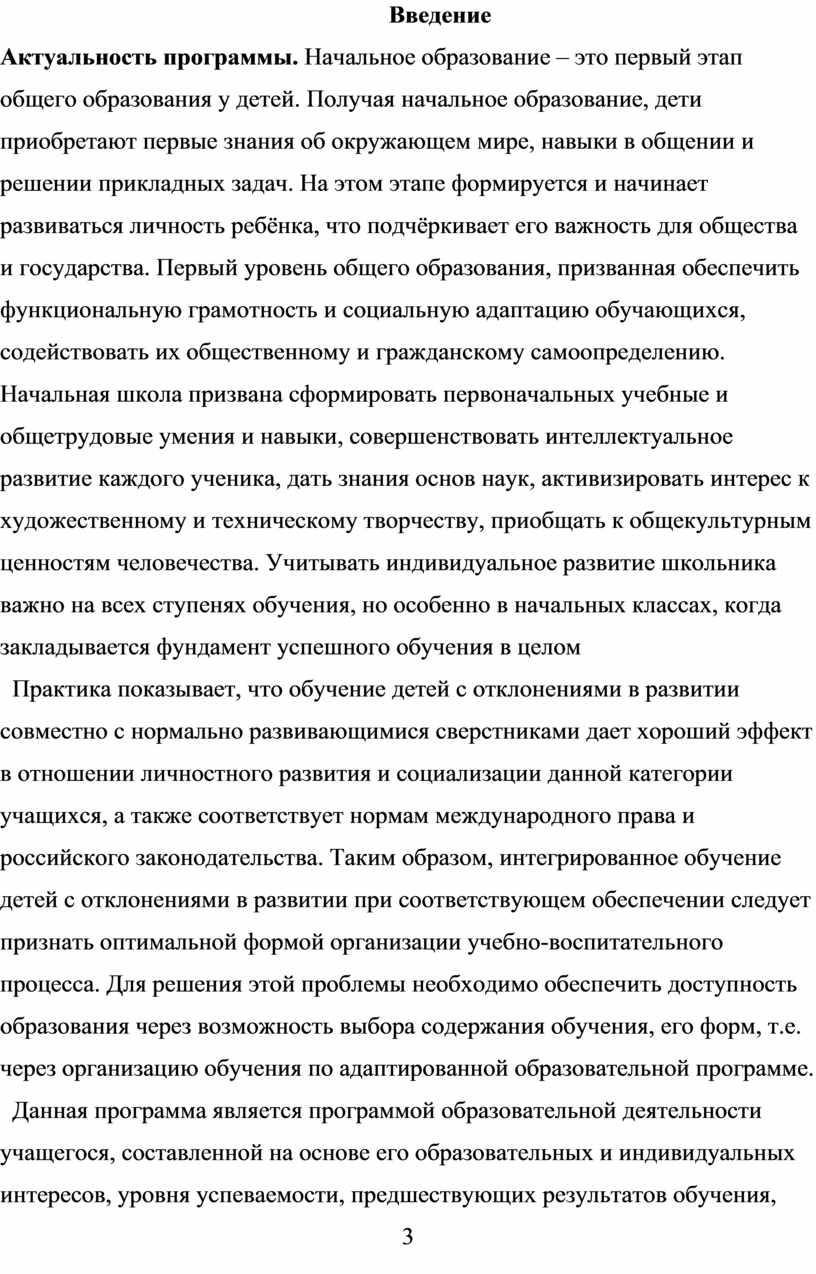 Практика показывает, что обучение детей с отклонениями в развитии совместно с нормально развивающимися сверстниками дает хороший эффект в отношении личностного развития и социализации данной категории учащихся, а также соответствует нормам международного права и российского законодательства. Таким образом, интегрированное обучение детей с отклонениями в развитии при соответствующем обеспечении следует признать оптимальной формой организации учебно-воспитательного процесса. Для решения этой проблемы необходимо обеспечить доступность образования через возможность выбора содержания обучения, его форм, т.е. через организацию обучения по адаптированной образовательной программе.