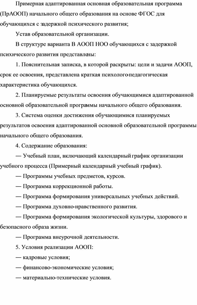 Примерная адаптированная основная образовательная программа (далее ПрАООП) начального общего образования детей с задержкой психического развития – это учебно-методическая документация, определяющая рекомендуемые федеральным государственным образовательным стандартом объем и содержание образования, планируемые результаты освоения образовательной программы, примерные условия образовательной деятельности, включая примерные расчеты нормативных затрат оказания государственных услуг по реализации образовательной программы. В структуру ПрАООП включаются: примерный учебный план, примерный календарный учебный график, примерные рабочие программы учебных предметов и иные компоненты.
