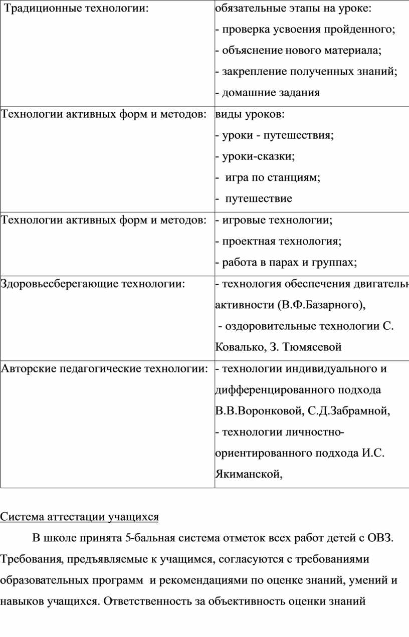 Подбор образовательных технологий основан на учете психофизиологических особенностей учащихся с ОВЗ. В своей образовательной деятельности, направленной на гармоничное развитие личности ребенка с ограниченными возможностями здоровья, учителя используют следующие педагогические технологии: