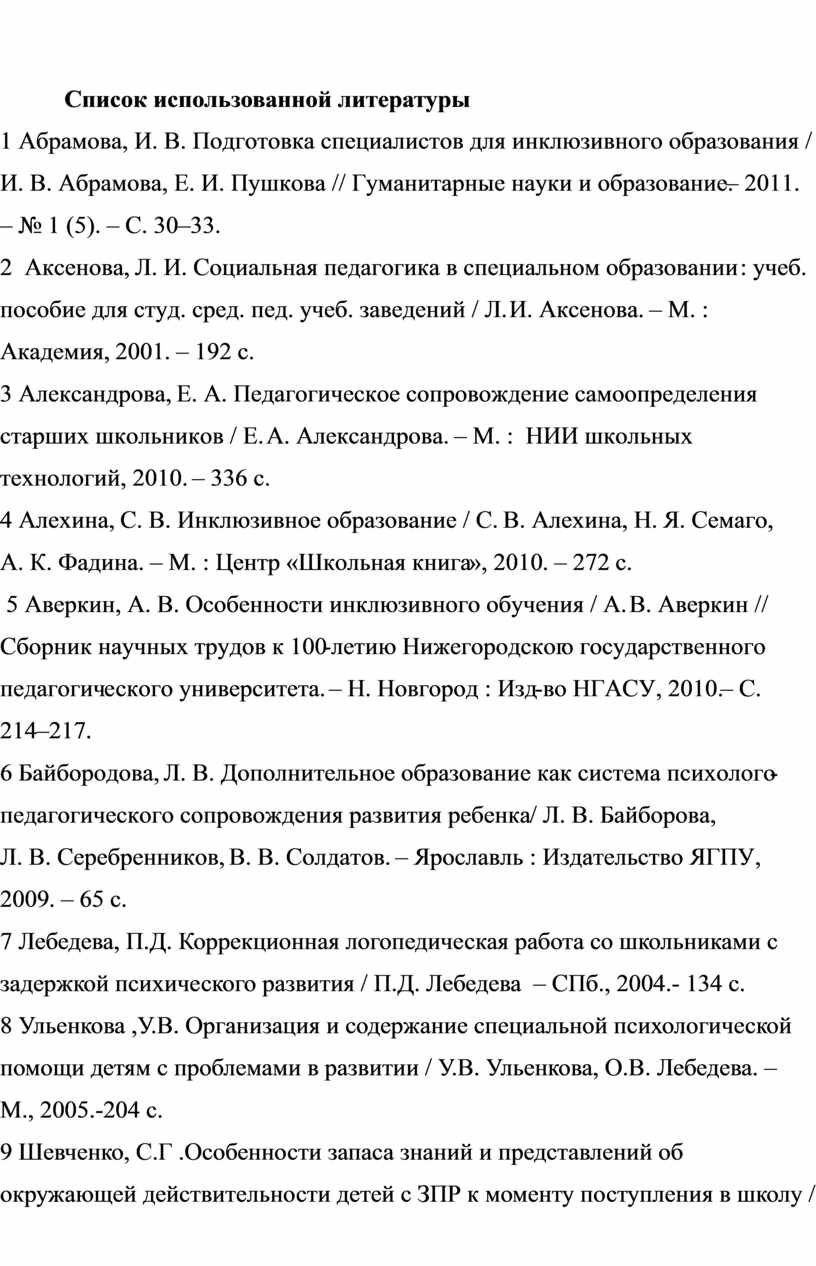 1 Абрамова, И. В. Подготовка специалистов для инклюзивного образования / И. В. Абрамова, Е. И. Пушкова // Гуманитарные науки и образование.– 2011. – № 1 (5). – С. 30–33.