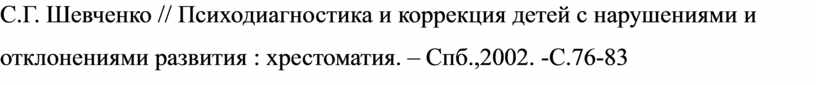 С.Г. Шевченко // Психодиагностика и коррекция детей с нарушениями и отклонениями развития : хрестоматия. – Спб.,2002. -С.76-83
